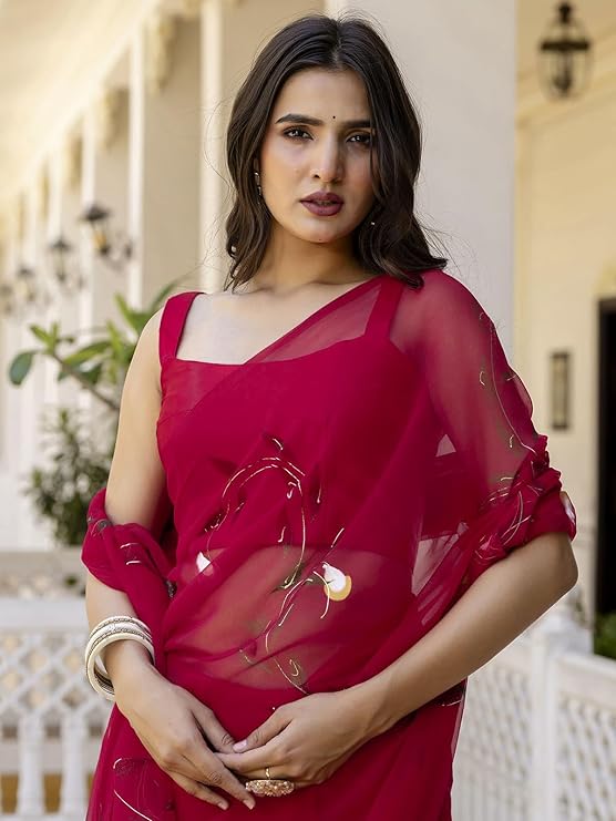is a celebration of refined femininity, designed for moments when you want to feel effortlessly elegant without trying too hard. Its flowing silhouette captures the softness of georgette while embracing the richness of a modern festive aesthetic.