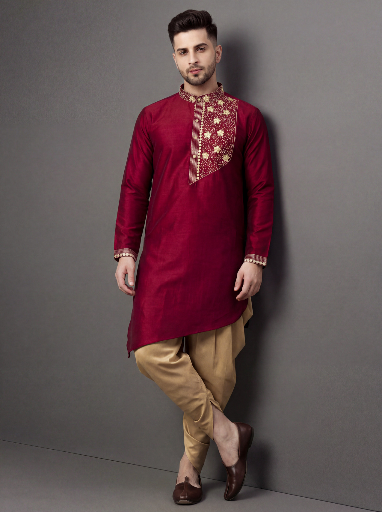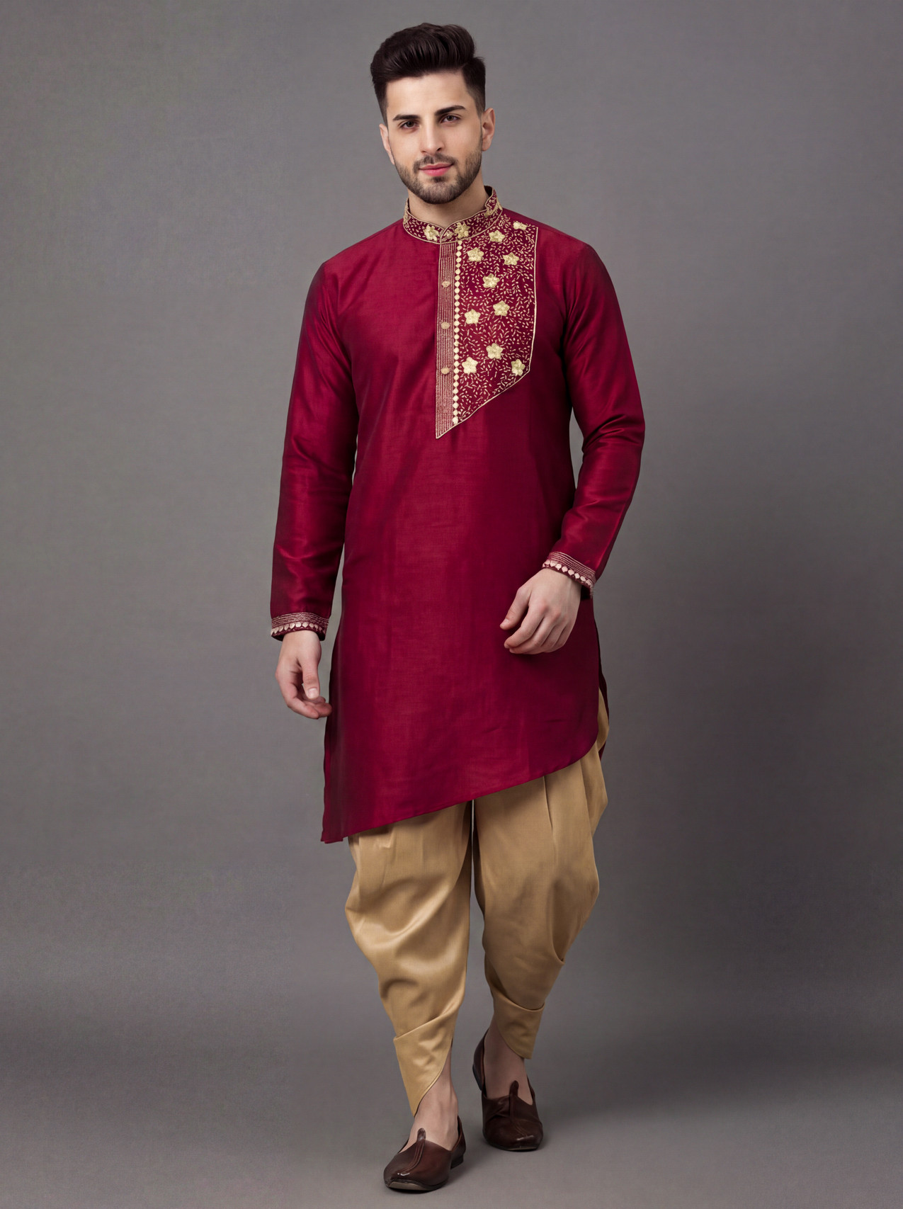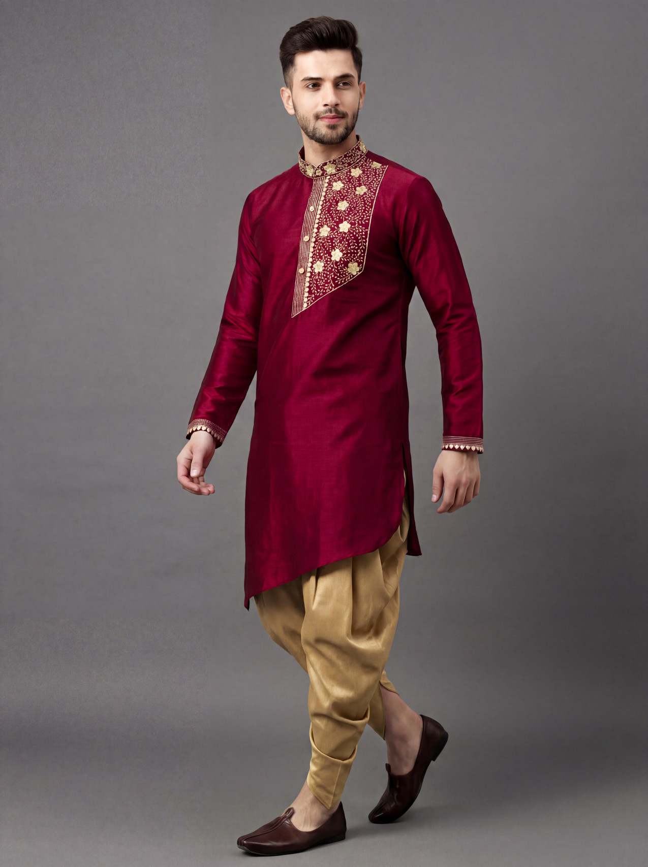 ✔ Full-sleeved kurta paired with dhoti-style pyjama